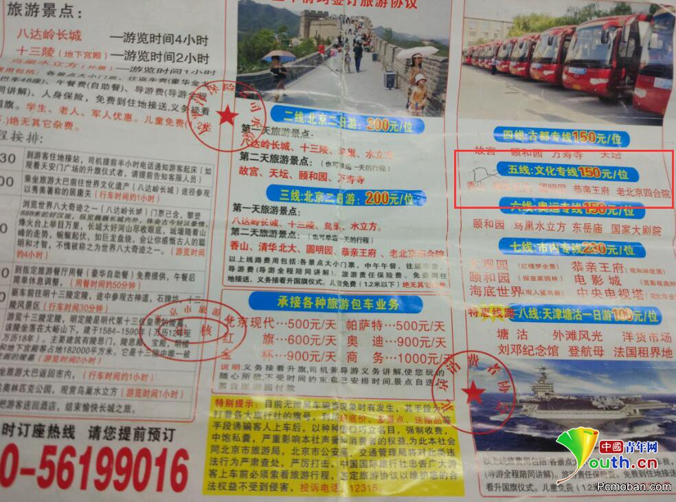 10月1日晚上记者通过宣传页上的热线联系了所谓"中国国旅总社",选择了"文化一日游",旅游项目包括:香山、清华、北大、圆明园、恭亲王府、老北京四合院。150元的团费,对方在电话中承诺打折到100元。